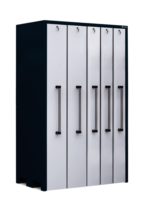 Lagerschrank mit 2 Vertikalauszügen à 300 mm Breite und 3 Vertikalauszügen à 200 mm Breite mit je 300 kg Traglast