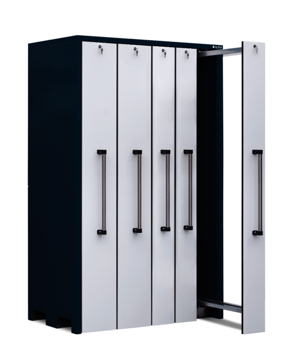 Struktur pulverbeschichtet in Schwarzgrau RAL 7021 (Korpus) und Grauweiß RAL 9002 (Auszüge)