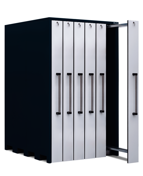 Lagerschrank mit 6 Vertikalauszügen à 200 mm Breite mit je 300 kg Traglast
