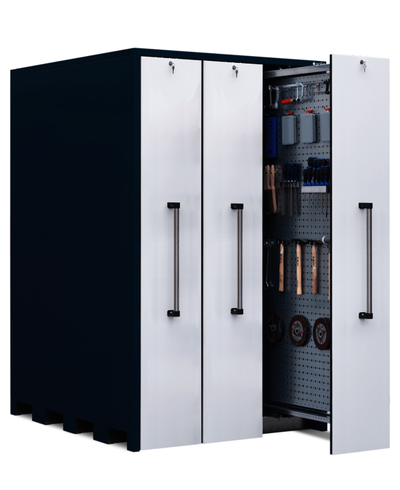 Der Vertikallagerschrank mit beidseitig nutzbaren Lochblechwänden