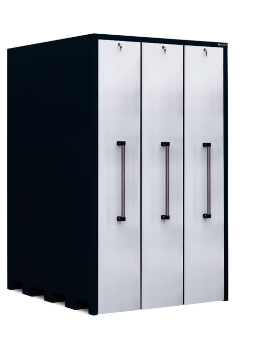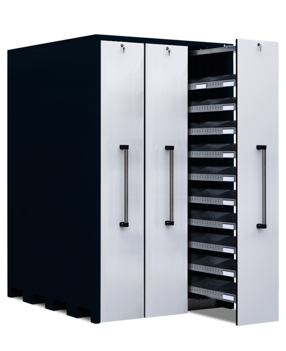 Der Vertikallagerschrank mit 10 Schüttgutwannen pro Auszug