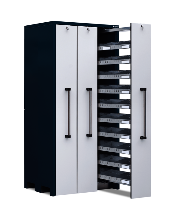 Der Vertikallagerschrank mit 10 Schüttgutwannen pro Auszug