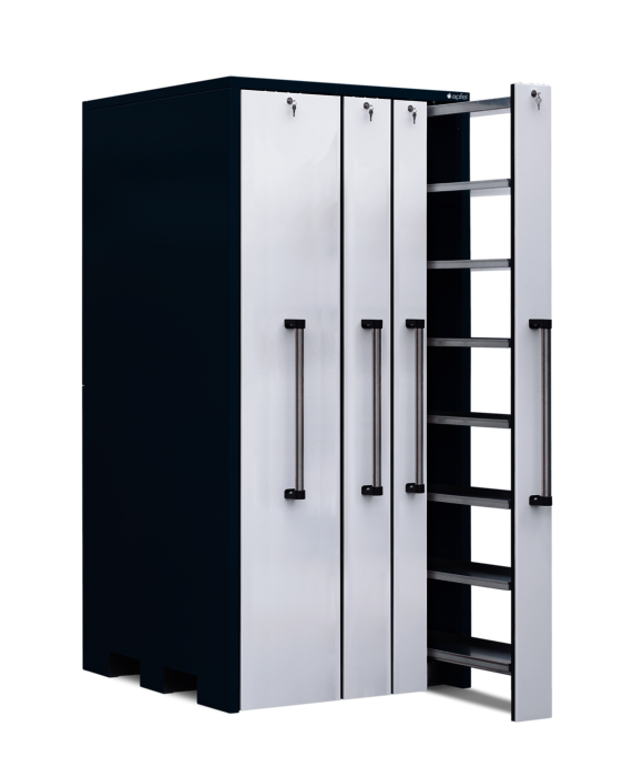 Lagerschrank mit 1 Vertikalauszug à 400 mm, 1 Vertikalauszug à 200 mm und 2 Vertikalauszügen à 150 mm Breite mit je 300 kg Traglast