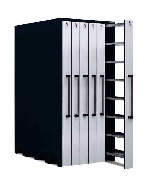 Lagerschrank mit 6 Vertikalauszügen à 150 mm Breite mit je 300 kg Traglast