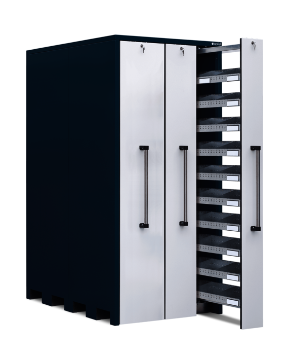 Der Vertikallagerschrank mit 10 Schüttgutwannen pro Auszug