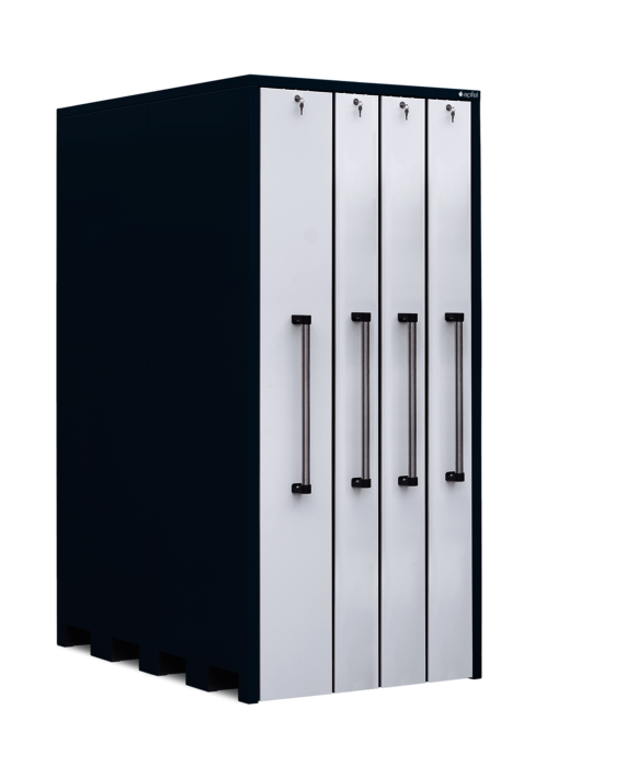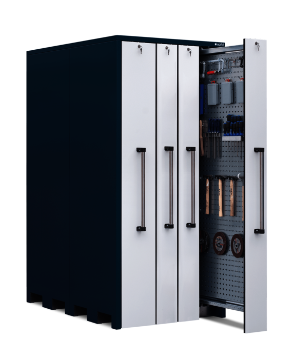Der Vertikallagerschrank mit beidseitig nutzbaren Lochblechwänden
