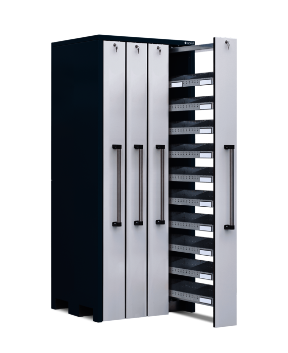 Der Vertikallagerschrank mit 10 Schüttgutwannen pro Auszug