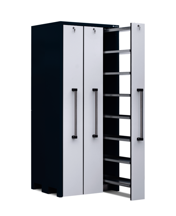 Lagerschrank mit 2 Vertikalauszügen à 300 mm und 1 Vertikalauszug à 200 mm Breite mit je 300 kg Traglast