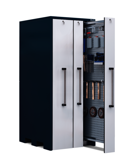 Der Vertikallagerschrank mit beidseitig nutzbaren Lochblechwänden