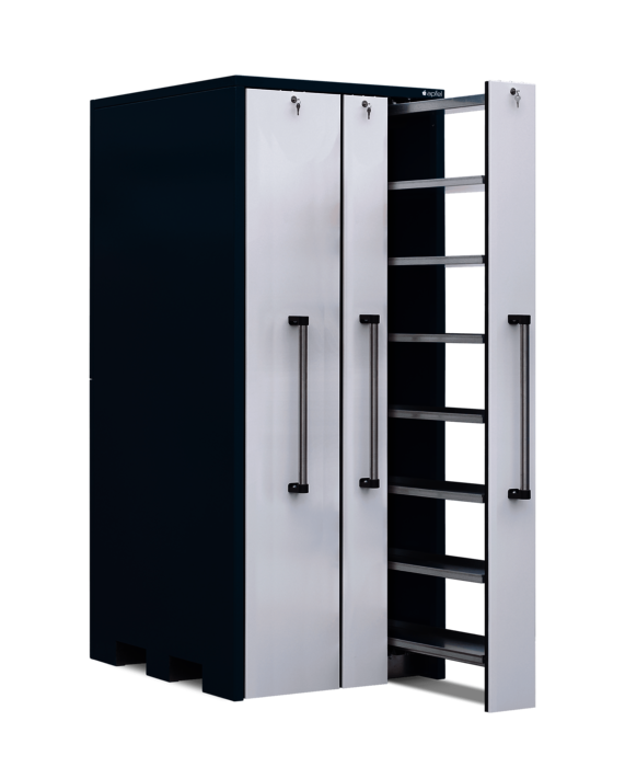Lagerschrank mit 1 Vertikalauszug à 400 mm und 2 Vertikalauszügen à 200 mm Breite mit je 300 kg Traglast