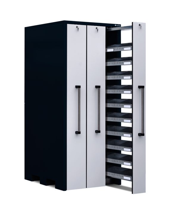 Der Vertikallagerschrank mit 10 Schüttgutwannen pro Auszug