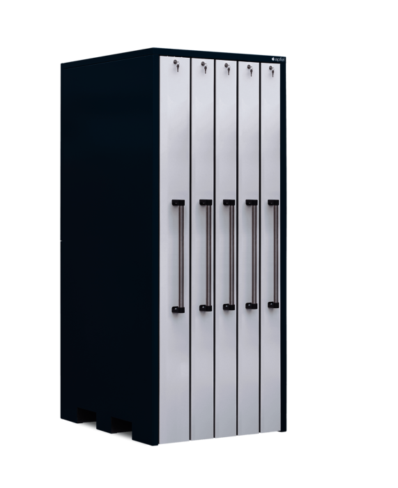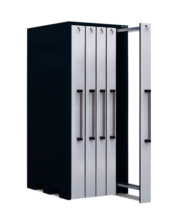 Lagerschrank mit 1 Vertikalauszug à 200 mm und 4 Vertikalauszügen à 150 mm Breite mit je 300 kg Traglast