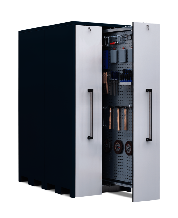 Der Vertikallagerschrank mit beidseitig nutzbaren Lochblechwänden