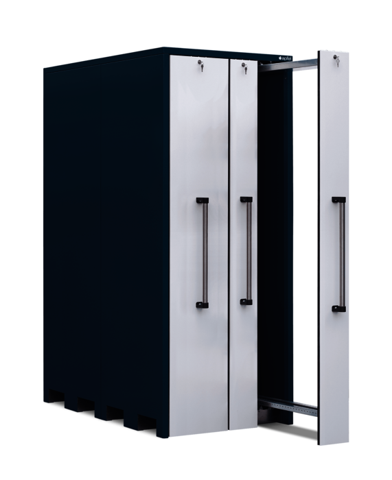 Lagerschrank mit 1 Vertikalauszug à 400 mm und 2 Vertikalauszügen à 200 mm Breite mit je 300 kg Traglast