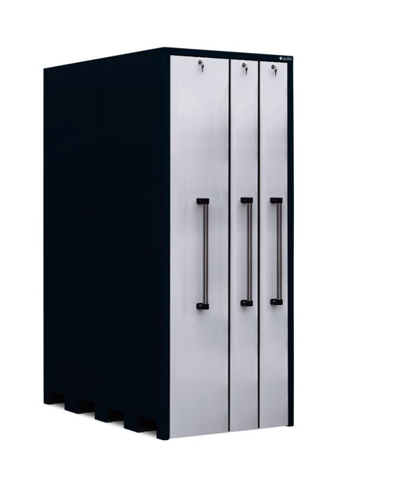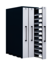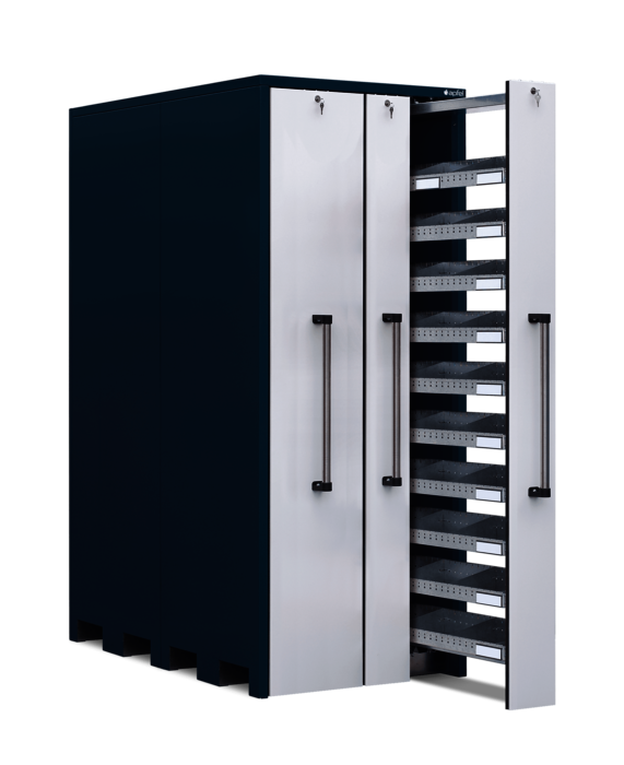 Der Vertikallagerschrank mit 10 Schüttgutwannen pro Auszug