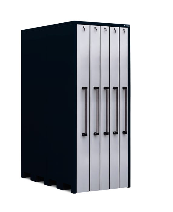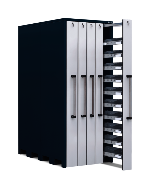 Der Vertikallagerschrank mit 10 Schüttgutwannen pro Auszug