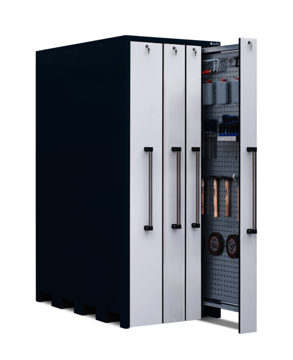Der Vertikallagerschrank mit beidseitig nutzbaren Lochblechwänden