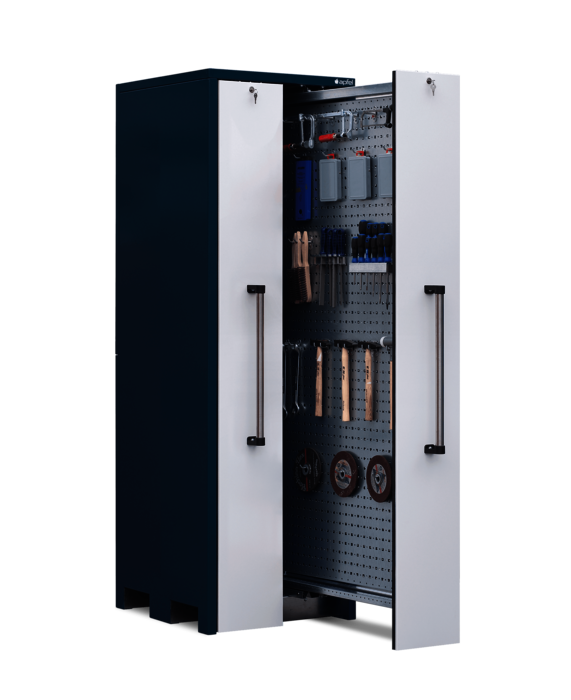 Der Vertikallagerschrank mit beidseitig nutzbaren Lochblechwänden