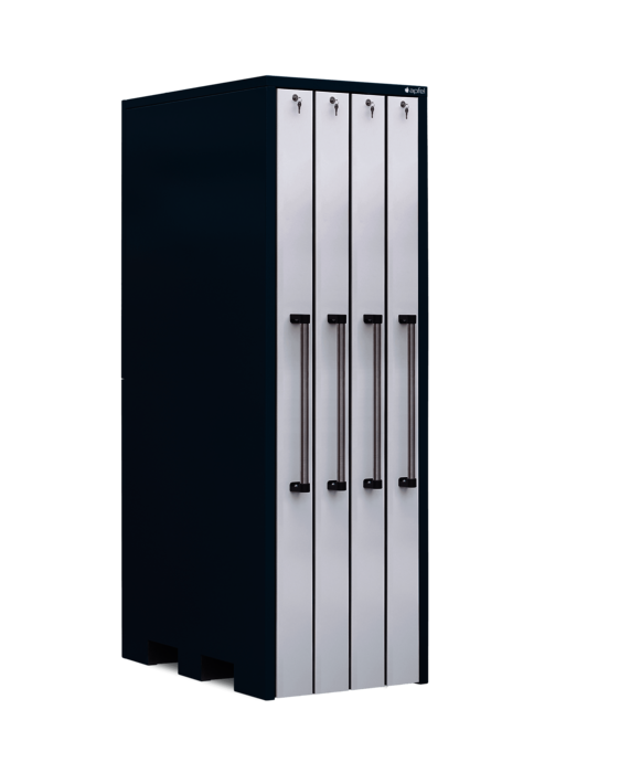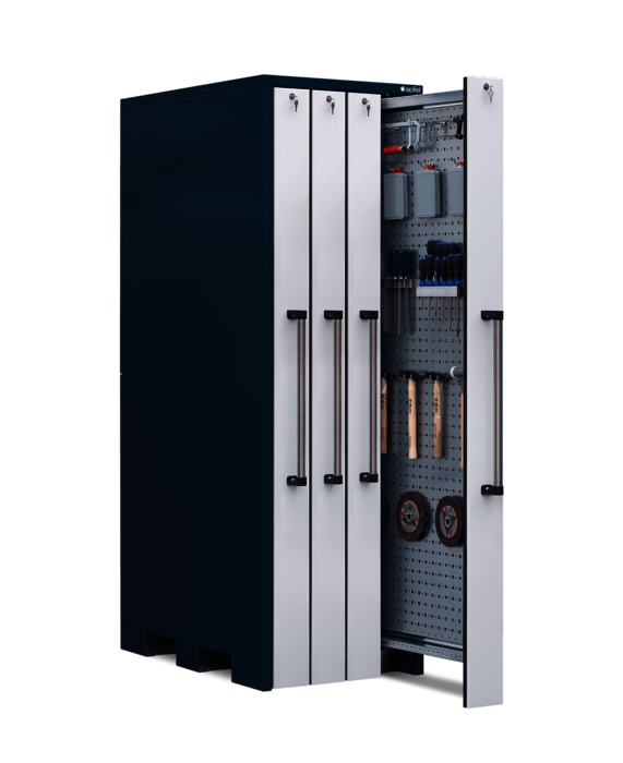 Der Vertikallagerschrank mit beidseitig nutzbaren Lochblechwänden