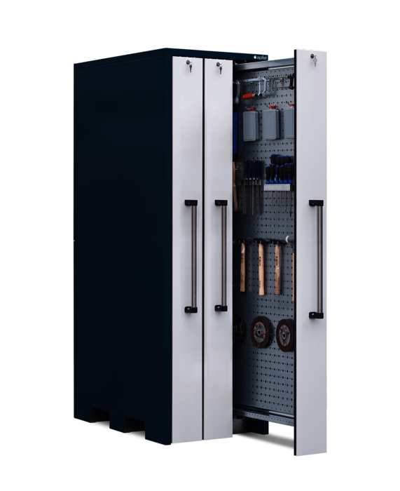 Der Vertikallagerschrank mit beidseitig nutzbaren Lochblechwänden