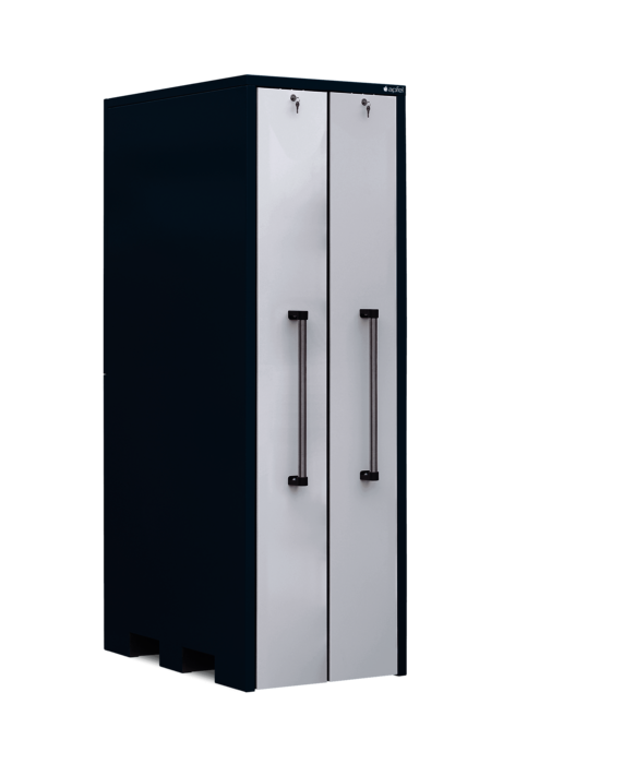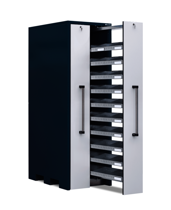 Der Vertikallagerschrank mit 10 Schüttgutwannen pro Auszug