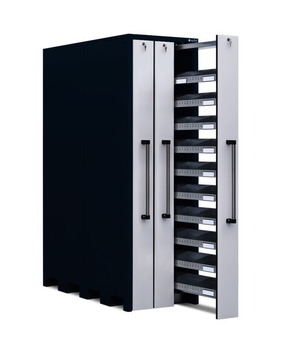 Der Vertikallagerschrank mit 10 Schüttgutwannen pro Auszug
