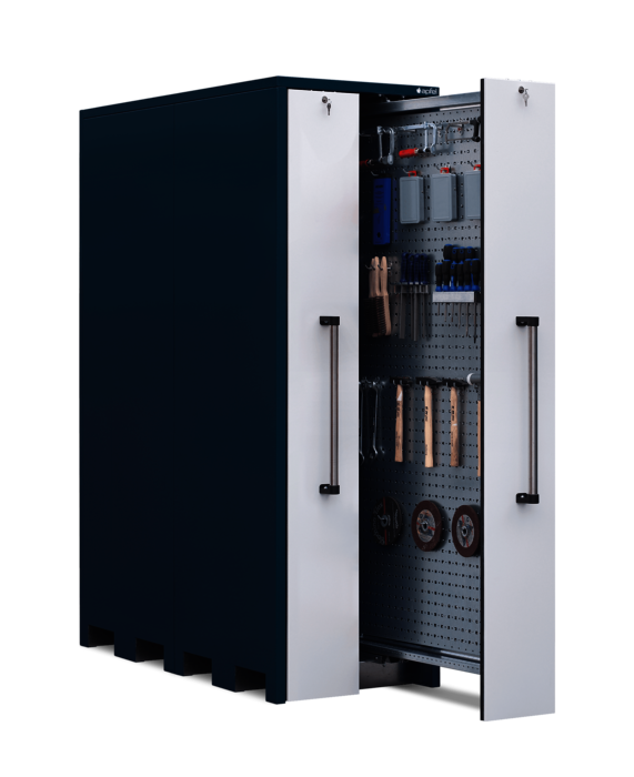 Der Vertikallagerschrank mit beidseitig nutzbaren Lochblechwänden