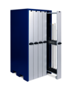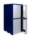 Struktur pulverbeschichtet in Enzianblau RAL 5010 (Korpus) und Grauweiß RAL 9002 (Auszüge)
