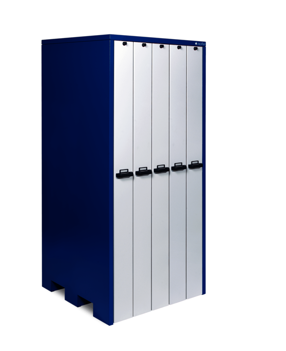 Struktur pulverbeschichtet in Enzianblau RAL 5010 (Korpus) und Grauweiß RAL 9002 (Auszüge)