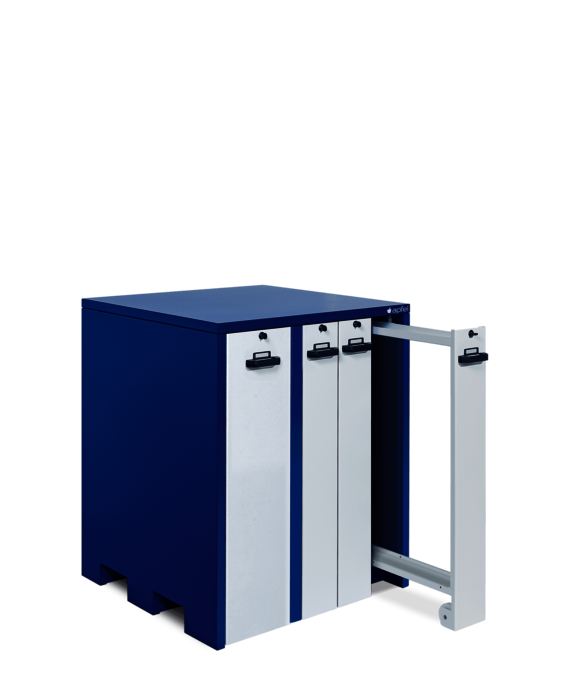 Struktur pulverbeschichtet in Enzianblau RAL 5010 (Korpus) und Grauweiß RAL 9002 (Auszüge)