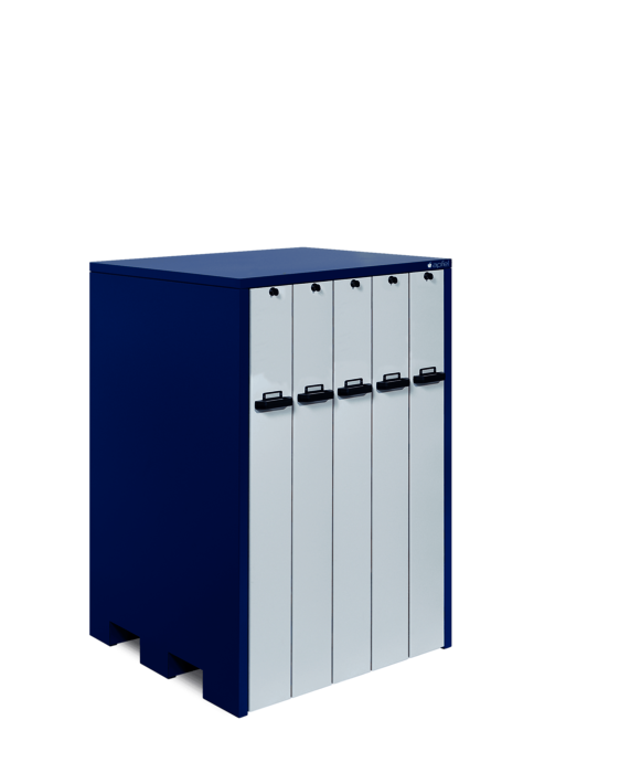 Struktur pulverbeschichtet in Enzianblau RAL 5010 (Korpus) und Grauweiß RAL 9002 (Auszüge)
