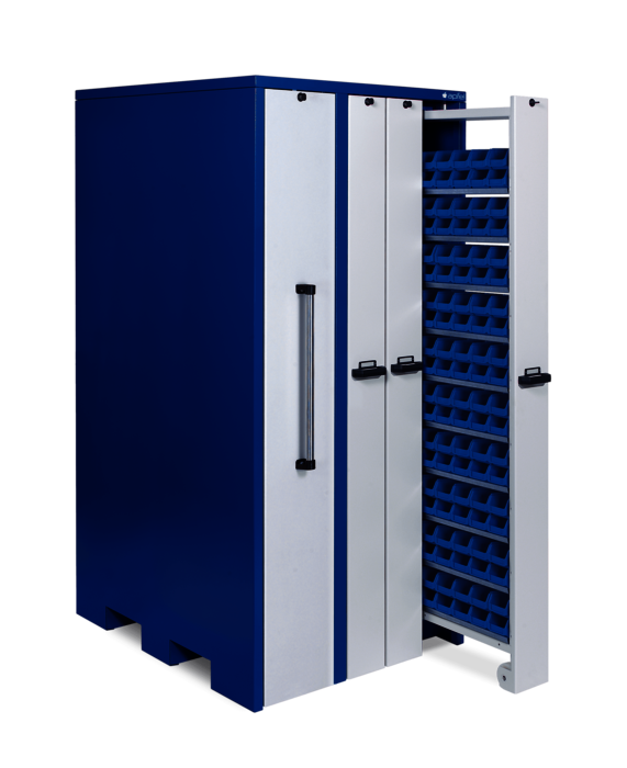 Der kombinierte Werkzeugschrank mit 250 mm erweiterter Tiefe und verschiedenen Auszügen zur Kanban-Lagerung in gestapelten Kästen sowie der konventionellen Bevorratung in Lagerwannen mit Trennblechen