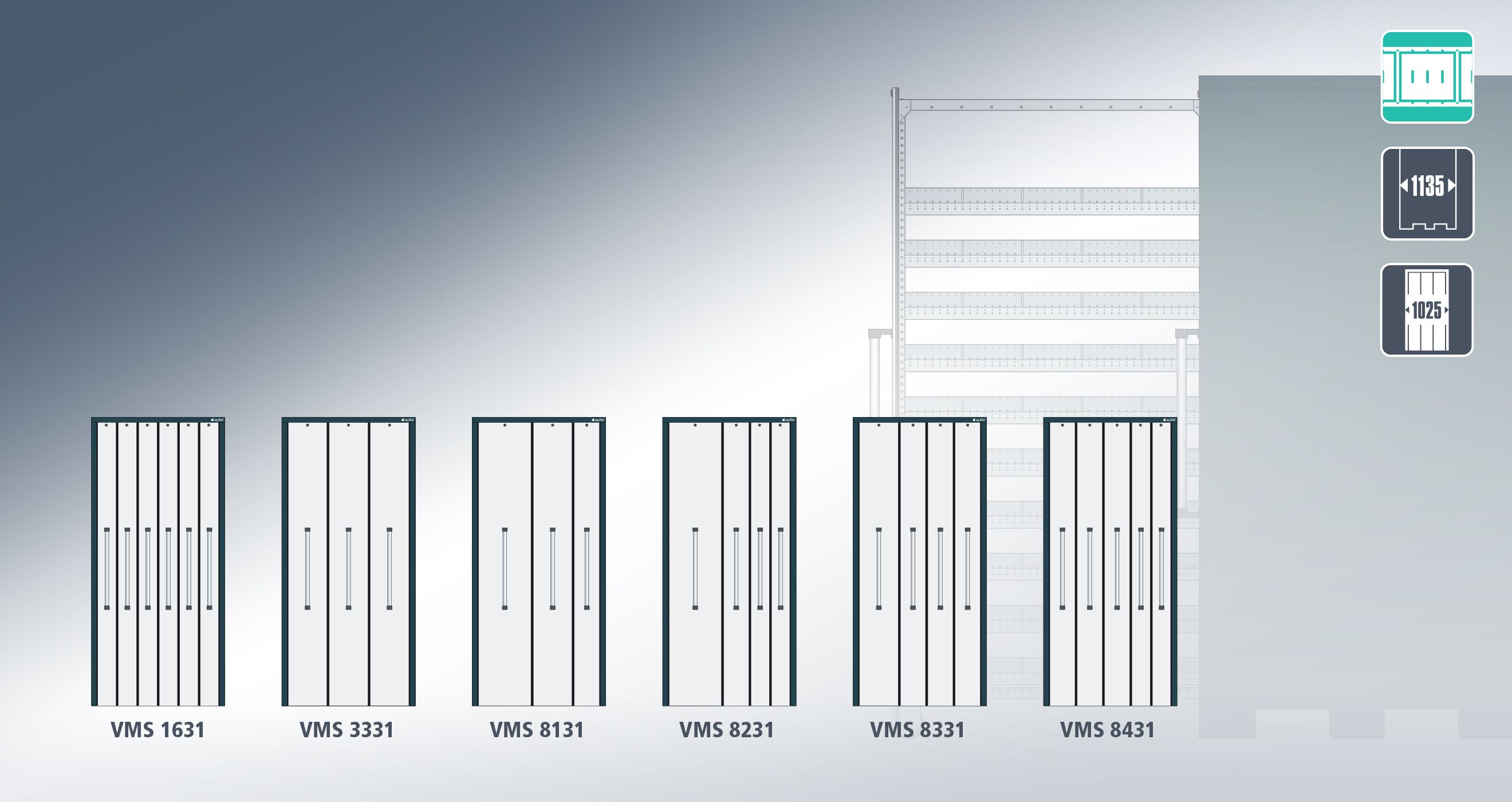 - VMS 8231 (1 cassetto di 400 mm di larghezza, 1 cassetto di 200 mm di larghezza, 2 cassetti di 150 mm di larghezza)