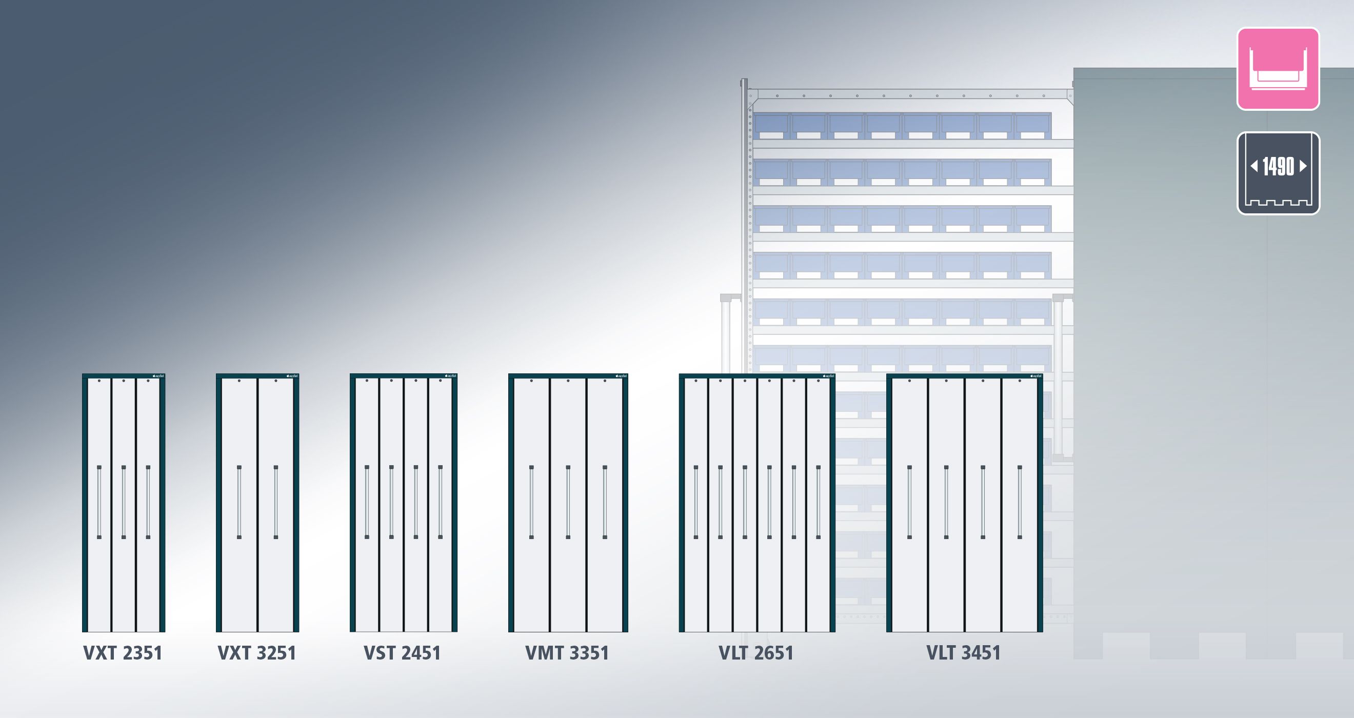 Gli armadi magazzino Set K1 con 1.490 mm di profondità: