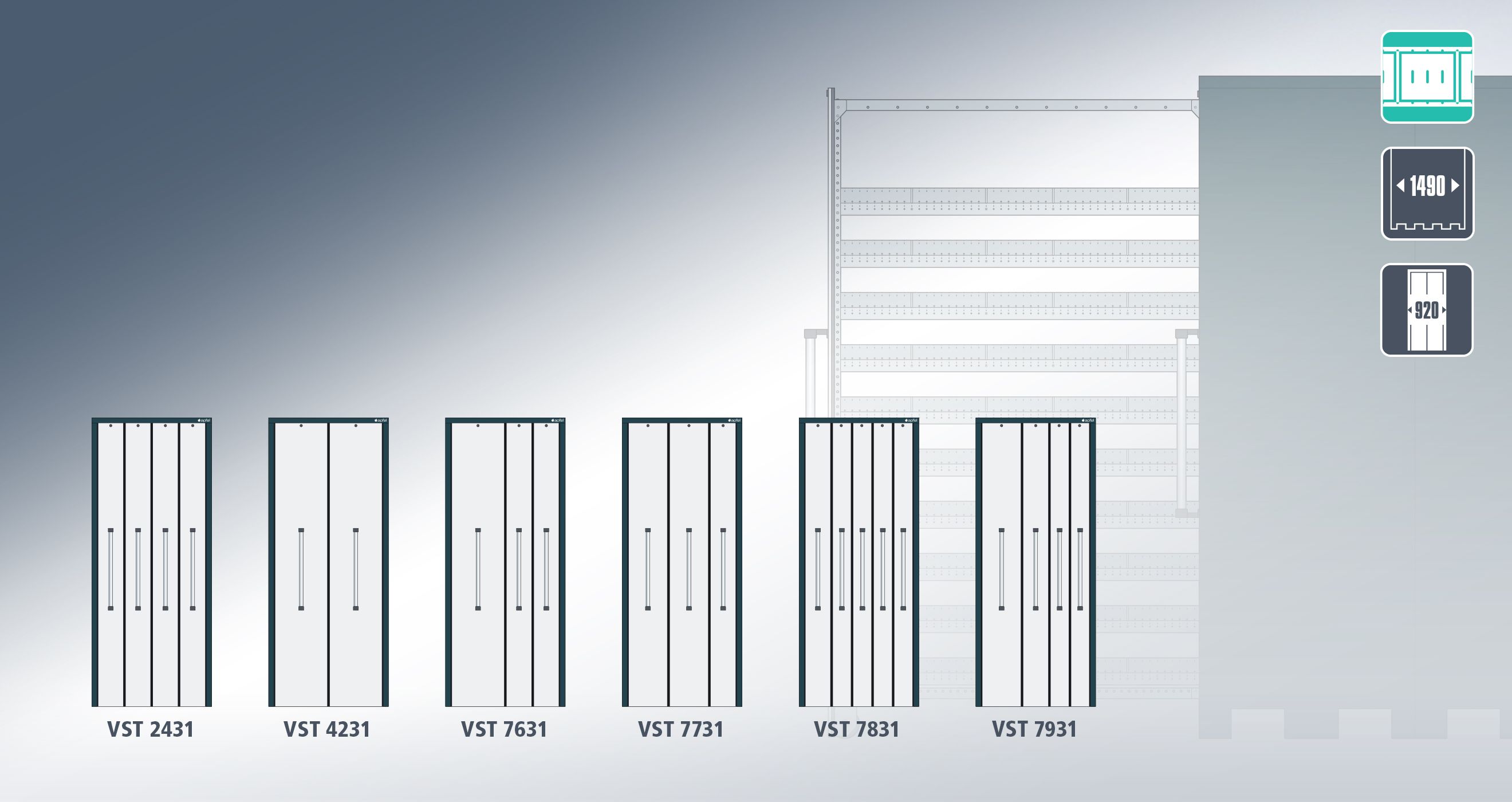 - VST 7931 (1 cassetto di 300 mm di larghezza, 1 cassetto di 200 mm di larghezza. 2 cassetti di 150 mm di larghezza)