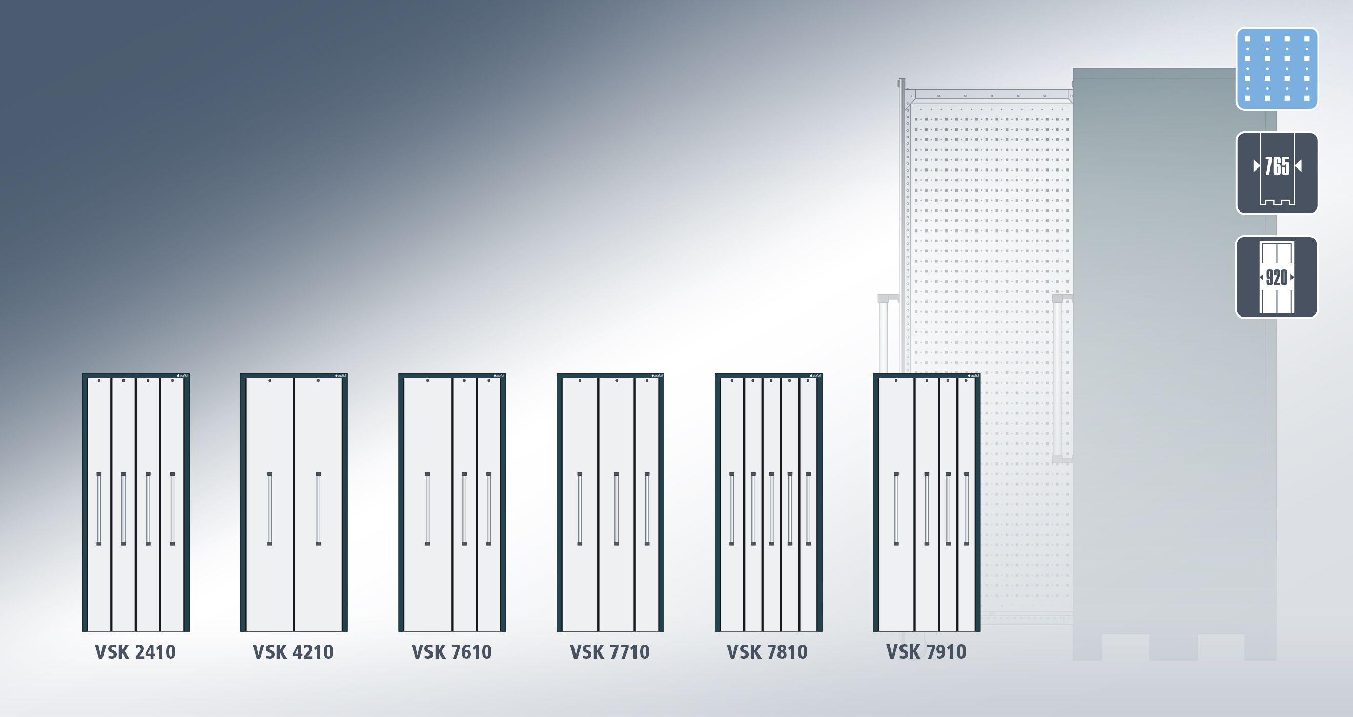 - VSK 7910 (1 cassetto di 300 mm di larghezza, 1 cassetto di 200 mm di larghezza. 2 cassetti di 150 mm di larghezza)