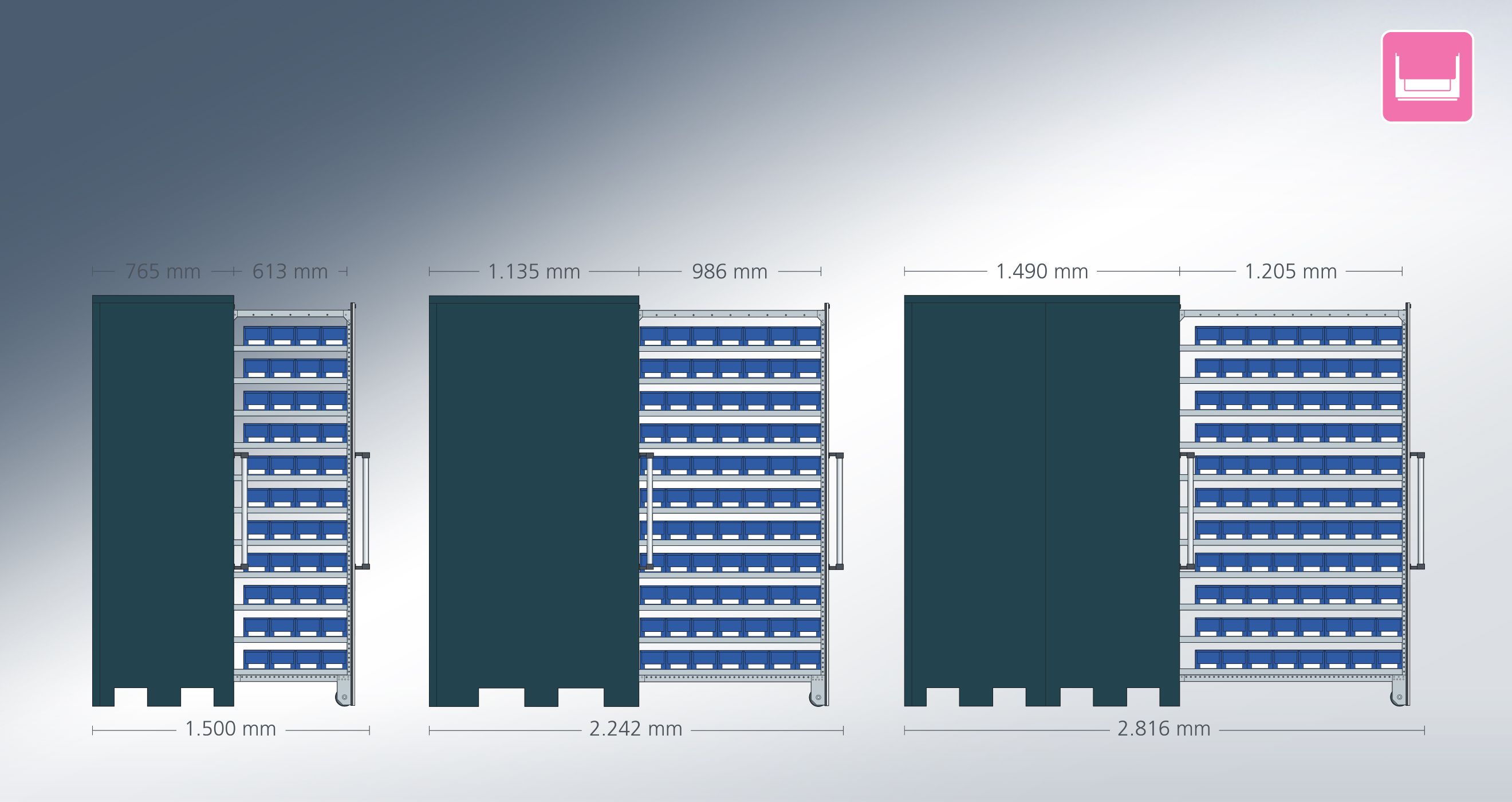 Gli armadi della serie V con contenitori a bocca di lupo sono disponibili come Set K1 in tre profondità differenti: