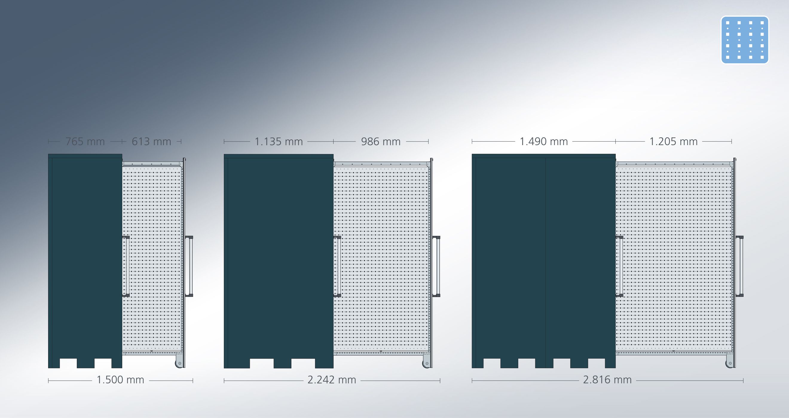 Gli armadi della serie V sono disponibili con pannelli forati come Set KFZ in tre profondità differenti: