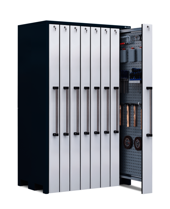 Der Vertikallagerschrank mit beidseitig nutzbaren Lochblechwänden