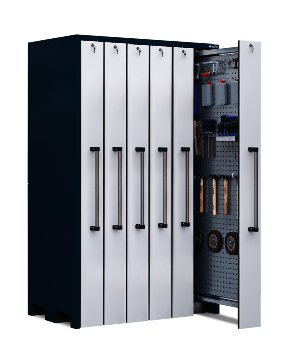 Der Vertikallagerschrank mit beidseitig nutzbaren Lochblechwänden