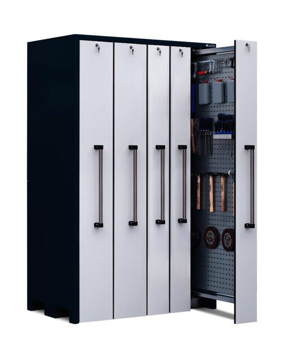 Der Vertikallagerschrank mit beidseitig nutzbaren Lochblechwänden