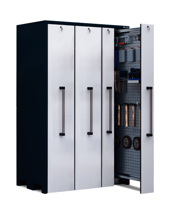 Der Vertikallagerschrank mit beidseitig nutzbaren Lochblechwänden