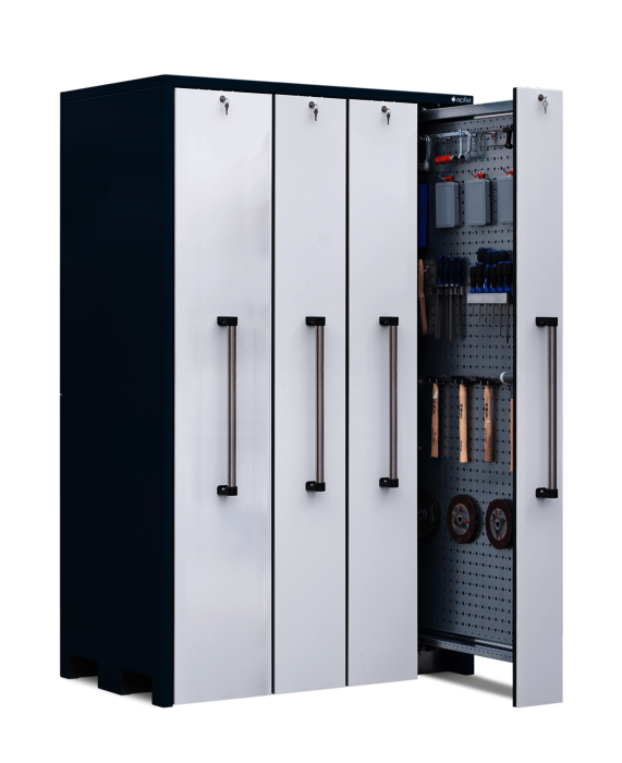 Der Vertikallagerschrank mit beidseitig nutzbaren Lochblechwänden