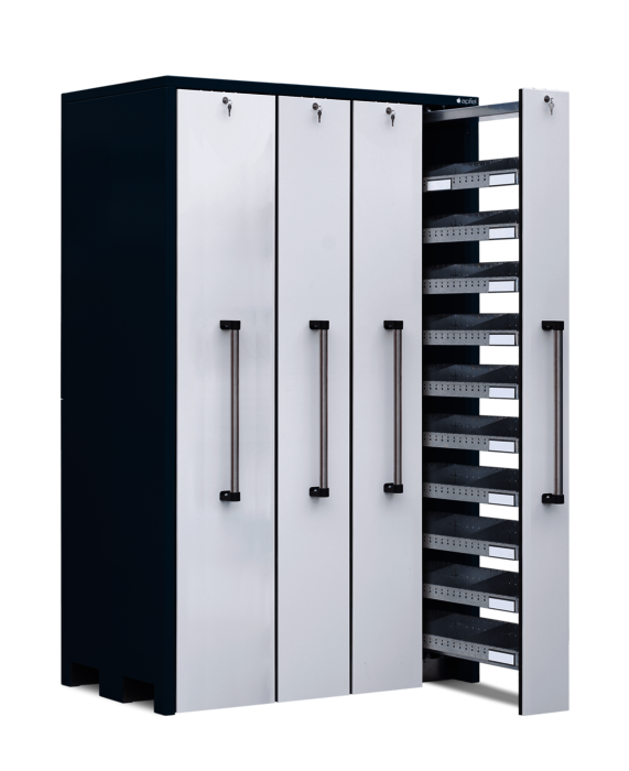 Der Vertikallagerschrank mit 10 Schüttgutwannen pro Auszug