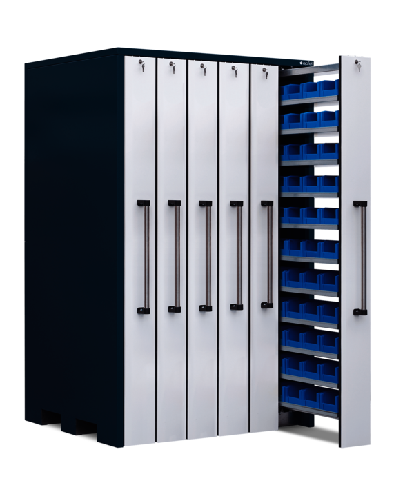 Lagerschrank mit 6 Vertikalauszügen à 200 mm Breite mit je 300 kg Traglast