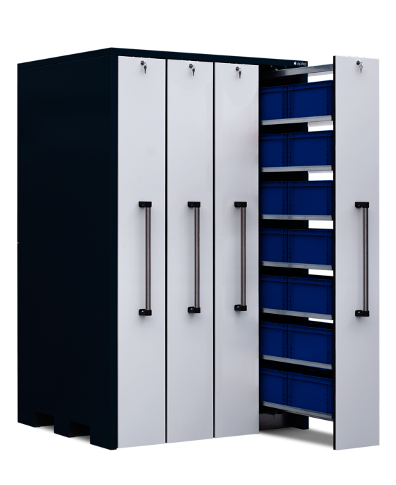 Lagerschrank mit 4 Vertikalauszügen à 300 mm Breite mit je 300 kg Traglast