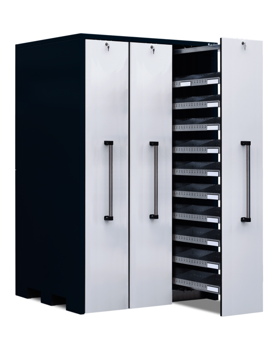 Der Vertikallagerschrank mit 10 Schüttgutwannen pro Auszug