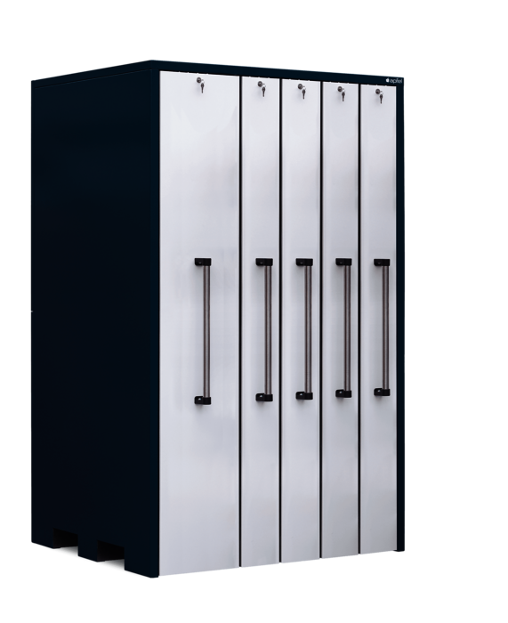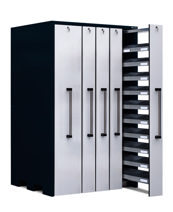Der Vertikallagerschrank mit 10 Schüttgutwannen pro Auszug