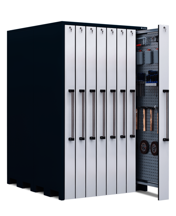 Der Vertikallagerschrank mit beidseitig nutzbaren Lochblechwänden