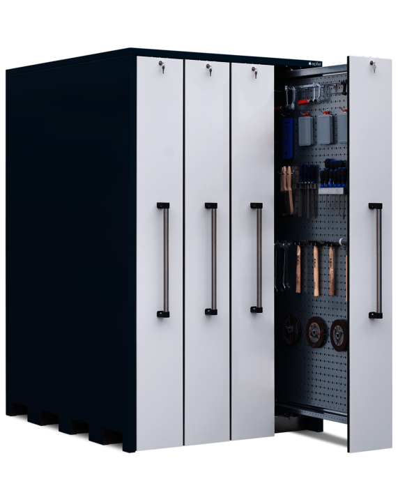 Der Vertikallagerschrank mit beidseitig nutzbaren Lochblechwänden